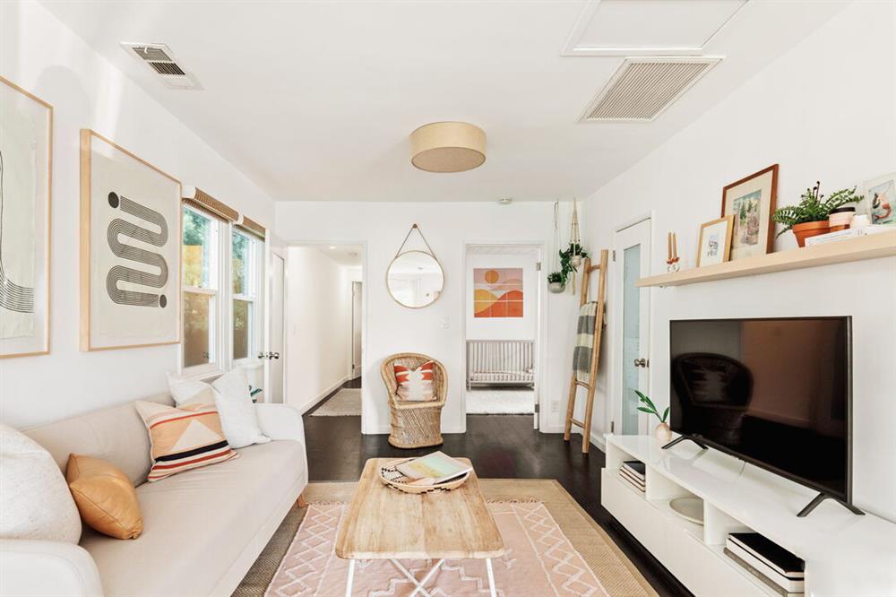 Trung tâm căn phòng là ghế sofa gam màu trung tính. Cùng với đó là ghế mây đan, bàn trà gỗ tự nhiên và thảm trải sàn chất liệu vải dệt. Sự khéo léo trong cách lựa chọn nội thất giúp gia chủ tạo ra 1 không gian nghỉ ngơi vô cùng dễ chịu.