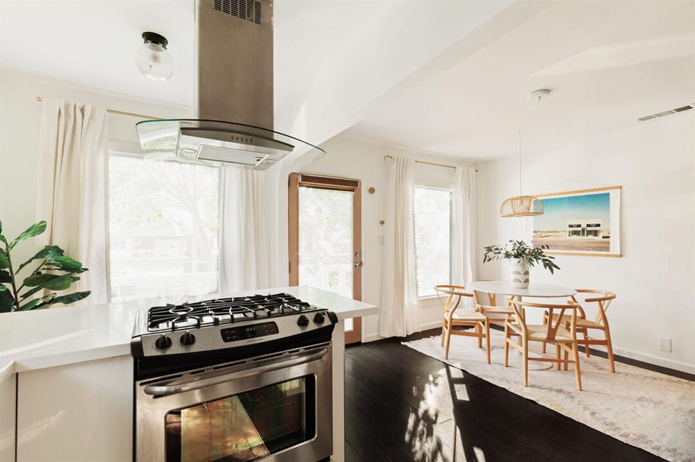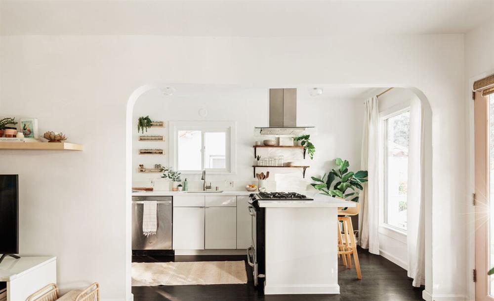 Căn bếp được thiết kế theo hình chữ U với một hệ thống tủ bếp khoa học cung cấp không gian lưu trữ tiện lợi. Gia chủ còn lắp thêm kệ mở trong bếp để lưu trữ gia vị, cốc chén thường dùng đến. Tất nhiên, bên trong căn bếp cũng không vắng mặt những chậu cây xanh nhỏ mang lại vẻ đẹp đầy sức sống.