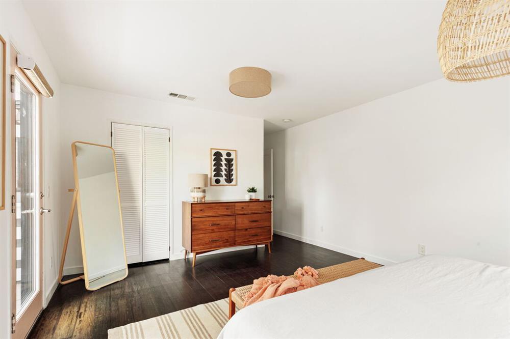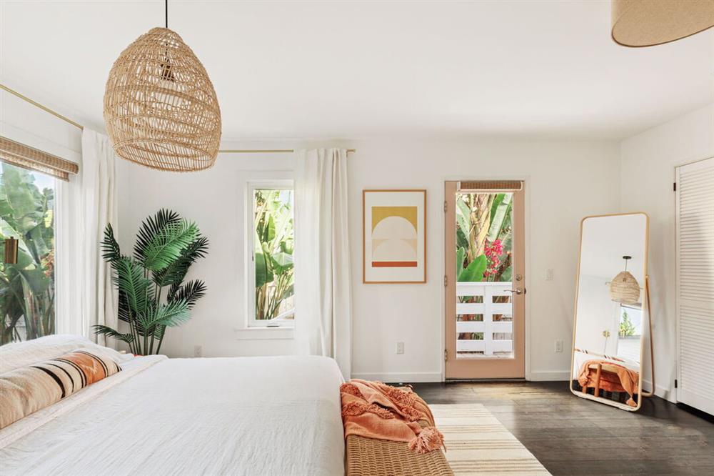 Giường ngủ được đặt tại vị trí trung tâm của căn phòng. Hai bên đầu giường đều có kệ nhỏ và cây xanh tạo nên khung cảnh bình yên, dịu mát. Ngoài ra, việc hạn chế lựa chọn quá nhiều nội thất trong phòng cũng là bí quyết giúp tạo ra bầu không khí thoải mái.