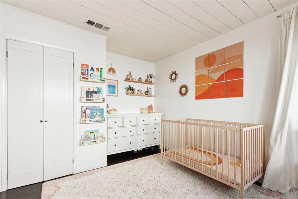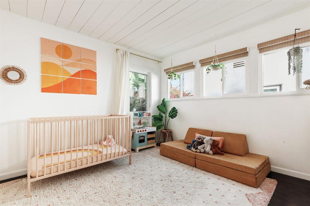 Phòng của bé cũng được trang trí vô cùng ấn tượng. Ngoài cũi ngủ thì trong phòng còn có tủ để đồ, ghế sofa dáng thấp phù hợp với chiều cao của bé. Nhưng ấn tượng nhất phải kể đến tranh treo tường rực rỡ sắc màu khiến bạn bị thu hút ngay khi tiến vào phòng. Ngoài ra, sự có mặt của những cuốn sách tranh và đồ chơi của bé cũng góp phần tạo nên một không gian đậm chất trẻ thơ.