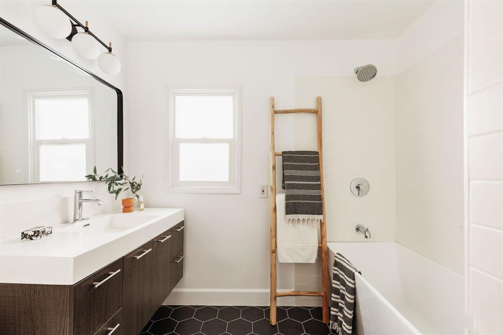 Nhà tắm nhỏ xinh mang phong cách hiện đại. Gia chủ lựa chọn kiểu gạch lát sàn hình lục giác màu xám chì. Không chỉ tạo ra hiệu ứng thị giác ấn tượng, sàn nhà tắm còn đem lại cảm giác sạch sẽ trong quá trình sử dụng.