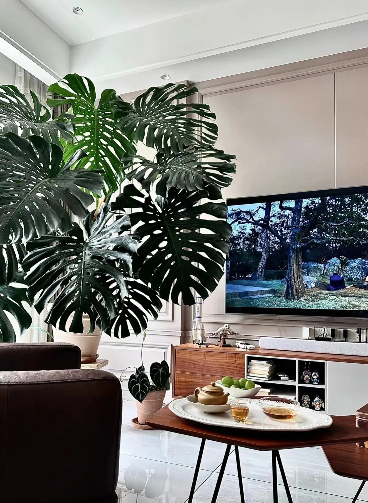 Cây cảnh này có kích cỡ lớn, đặc điểm nổi bật là những chiếc lá xanh khổng lồ, xanh bóng, căng mọng, xẻ ngang dọc giống như mai chú rùa lớn. Do đó, chúng mang ý nghĩa trường thọ, may mắn và sức khỏe.