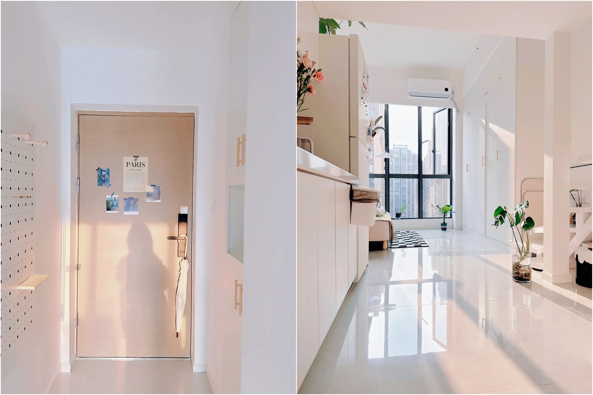 Để có được không gian sống tiện nghi bên trong căn hộ nhỏ xinh của mình, Tiểu Châu đã phải vận dụng nhiều mẹo hay trong thiết kế, nhất là những giải pháp lưu trữ thông minh. Bạn sẽ thấy được điều đó ngay khi vừa bước qua cánh cửa vào nhà. Tủ để giầy dép có thiết kế kịch trần, tận dụng triệt để không gian theo chiều dọc mang tới một không gian lưu trữ thoải mái cho cô nàng độc thân. Ngay tại lối vào, Tiểu Châu còn sử dụng bảng pegboard tiện lợi để tăng không gian lưu trữ.