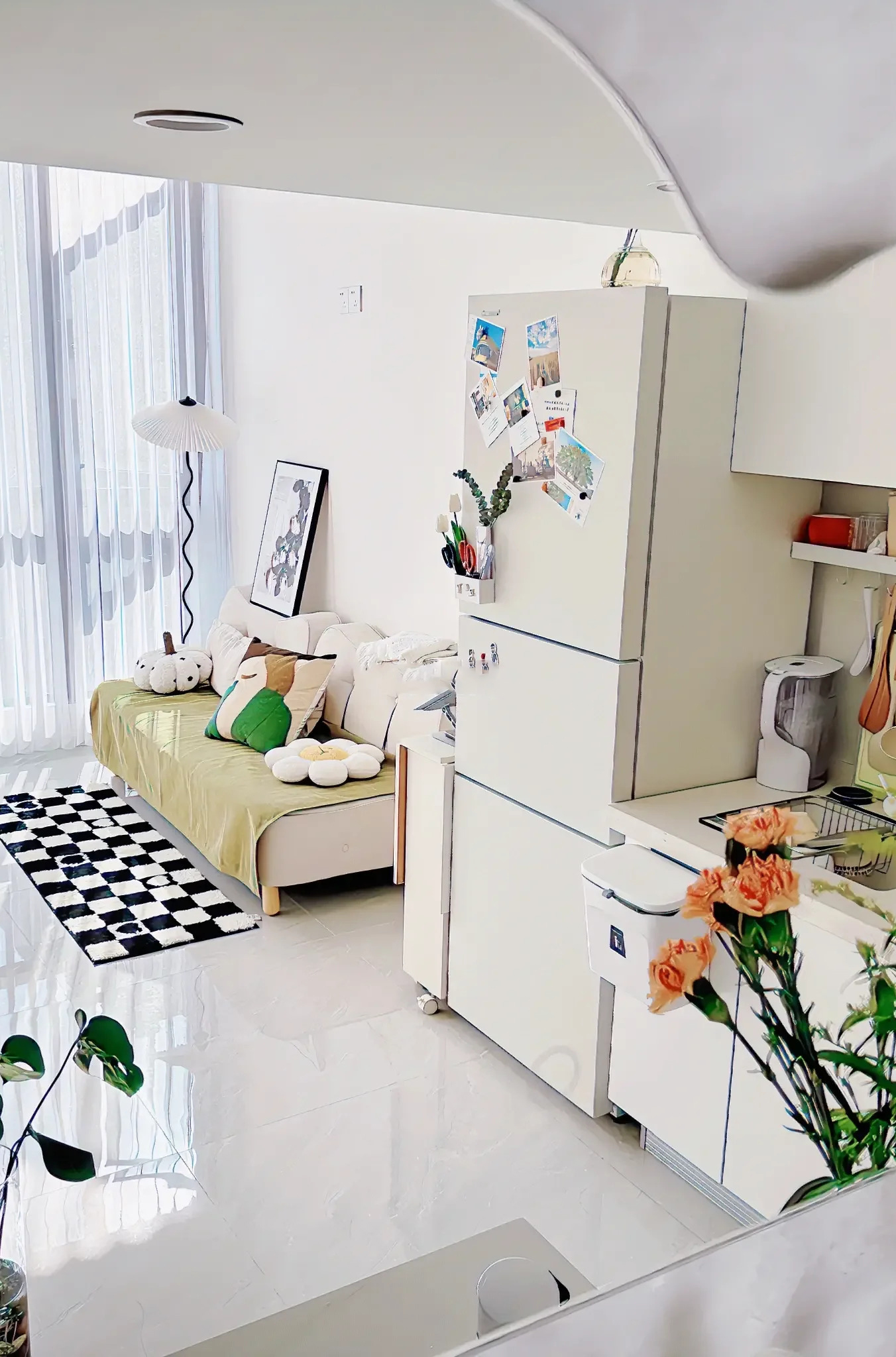 Diện tích eo hẹp rõ ràng là một nhược điểm của căn hộ này nhưng cũng vì thế mà Tiểu Châu có thể sở hữu căn hộ đầu tiên trong đời với mức giá thành phải chăng. Một ưu điểm của căn hộ không thể không nhắc tới chính là nguồn ánh sáng tự nhiên tuyệt vời. Với thiết kế cửa sổ trần cỡ lớn, thời gian nhận được ánh sáng tự nhiên trong ngày của căn hộ là khá nhiều. Điều này giúp cho không gian sống của Tiểu Châu luôn sáng sủa và vô cùng dễ chịu.