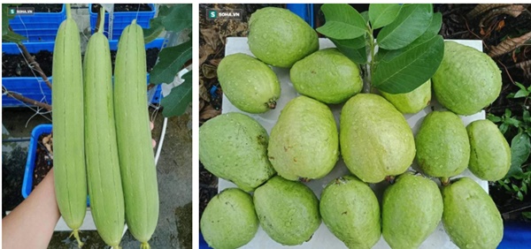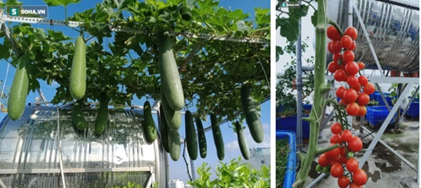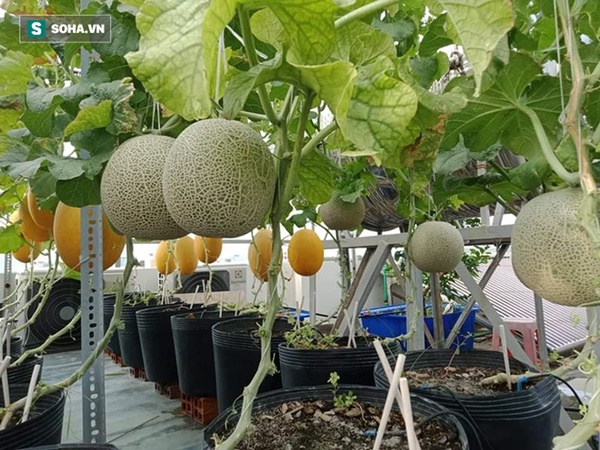 Khu vườn trên sân thượng của anh Giàu có diện tích khoảng 65m2, tuy nhiên, do để 2 bồn và dàn năng lượng mặt trời nên mặt sàn còn hơn 50m2. Anh Giàu dành 2 tháng để vác đất từ dưới nhà lên sân thượng để làm vườn và đầu tư khoảng 20 triệu đồng để mua thùng nhựa. Trên phần diện tích đó, anh Giàu trồng khá nhiều loại cây khác nhau, mùa nàu thức nấy, từ cà chua, ổi, mía cho đến nho, sung Mỹ, dưa lưới…
