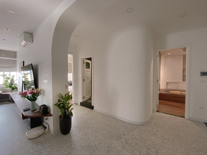 Phần thô của căn hộ gần như được thay mới hoàn toàn, ví dụ như thay đường điện nước, di chuyển vị trí điều hoà - cục nóng. Vách ngăn được đập bỏ để mở rộng không gian và lấy sáng thoáng. Phòng tắm trước đây có trần khá thấp. Tuy nhiên, sau khi được cơi nới lại, khu vực này không những rộng rãi hơn mà còn trở thành không gian thư giãn.