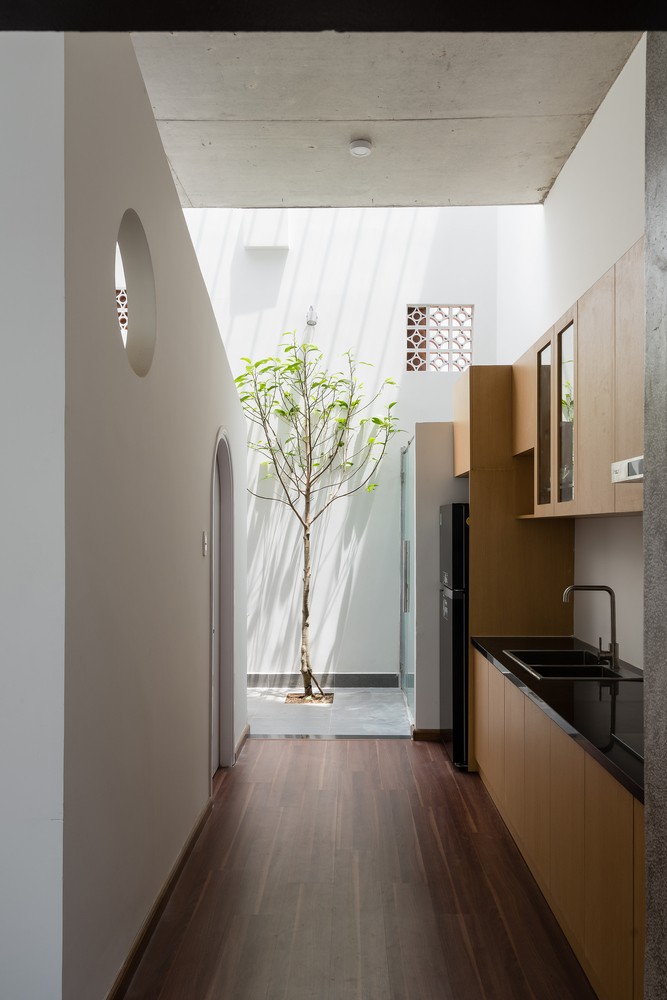 Để ánh sáng có thể đến mọi ngóc ngách trong nhà, kiến trúc sư cho bố trí nhiều cửa sổ dọc lối đi.