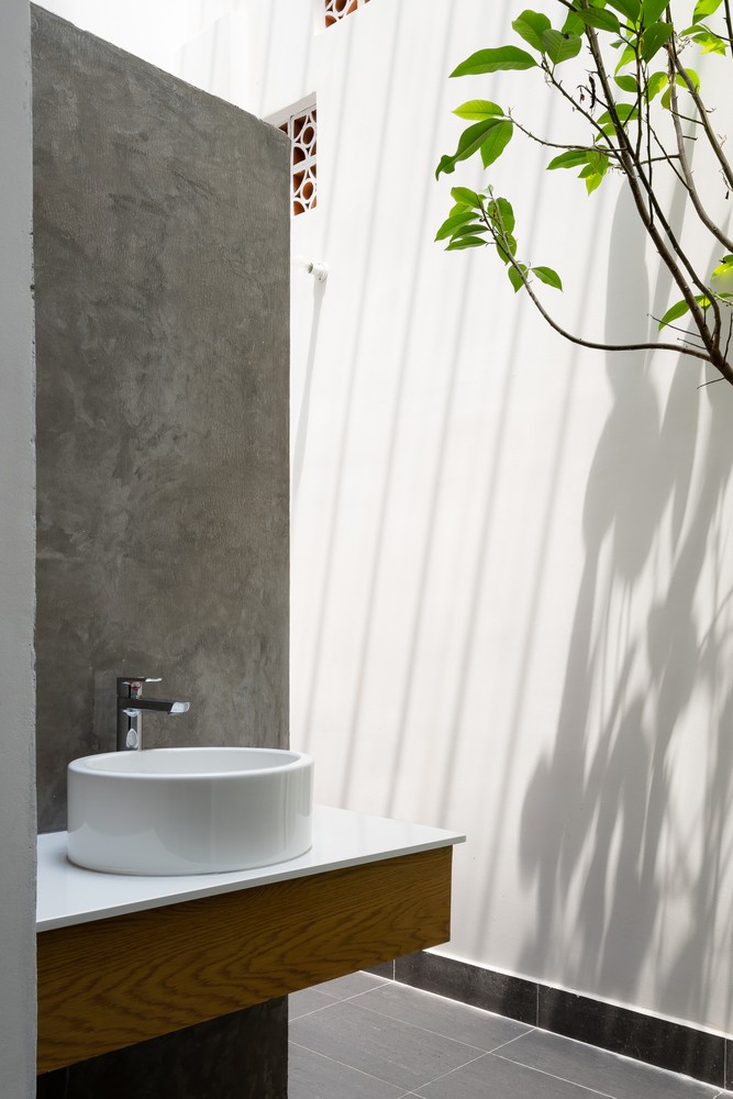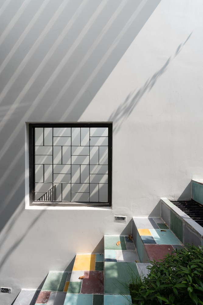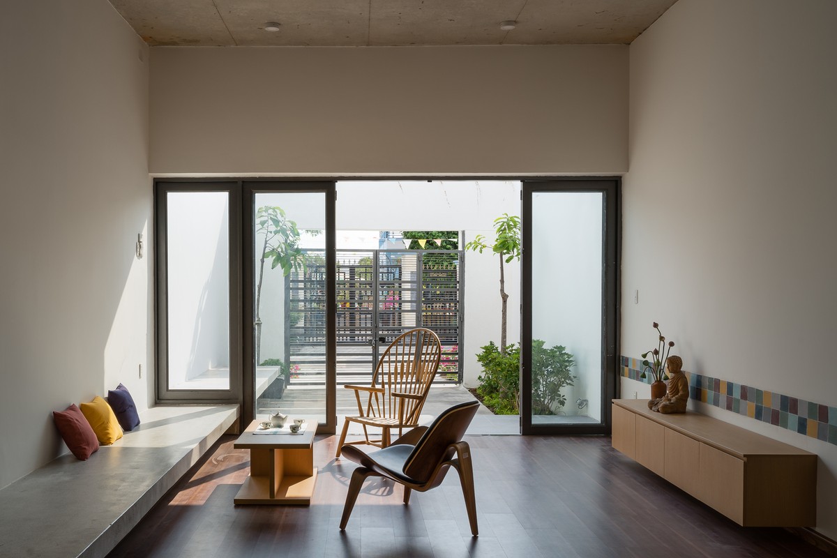 Cũng nhờ việc lùi mặt tiền vào bên trong, ngôi nhà hạn chế được việc bị ảnh hưởng bởi bụi bặm và tiếng ồn xung quanh.