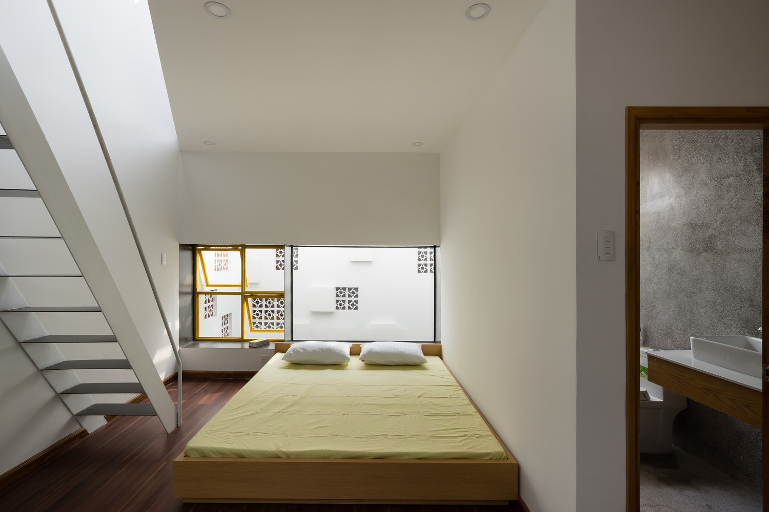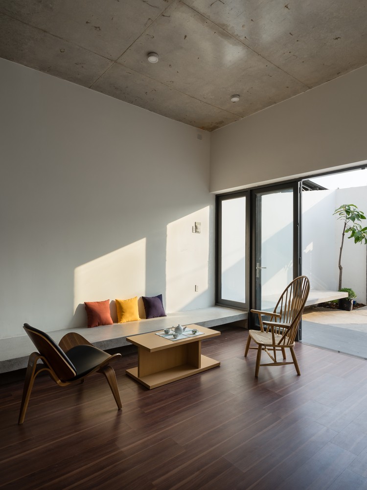 Ngôi nhà được thiết kế theo phong cách tối giản với trần bê tông, nội thất bố trí ngẫu hứng.