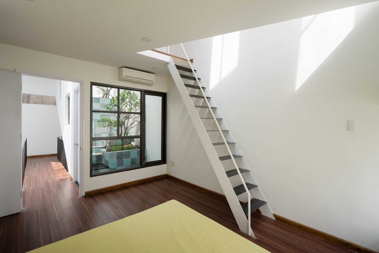 Do ngôi nhà có diện tích khiêm tốn nên cầu thang hẹp được bố trí ở giữa nhà.