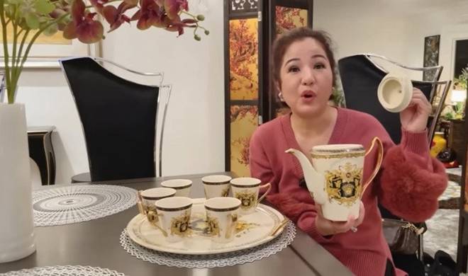 "Cậu này còn trẻ mà có đam mê sưu tầm đồ cổ", nữ danh hài chia sẻ. Ảnh trước, cô đang ngồi trong một phòng thờ sang trọng, còn đây là bàn trà có bộ bình trà Versace.