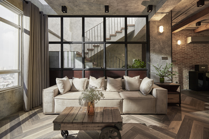Công trình có 3 tầng với tổng diện tích mặt sàn là 300 mét vuông. Căn penthouse được thiết kế theo xu hướng industrial (công nghiệp) với tông xám chủ đạo, phù hợp cá tính của hai vợ chồng.