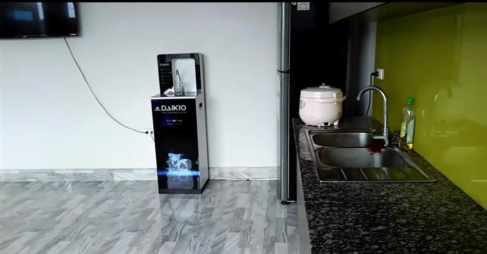 Ở gian bếp, anh đã lắp đặt nội thất hiện đại, có tủ lạnh và máy lọc nước xịn sò. Bộ bàn ăn dành cho 6 người được làm từ gỗ cũng rất kiên cố, thẩm mỹ.