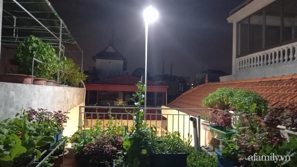 Chủ nhân của khu vườn sân thượng nhỏ xinh cho biết: "Vì vợ nghiện trồng rau nên chồng mình đã "thương tình" lắp cho hẳn giàn đèn và bóng cao áp để tiện hơn trong việc chăm cây vào những lúc rảnh rỗi. Do diện tích khiêm tốn nên mình vẫn luôn nghĩ đến việc cơi nới để thỏa niềm đam mê trồng trọt. Để khu vườn sân thượng tốt tươi, mình thường tưới đạm cá định kỳ. Không gian tuy nhỏ nhưng với các loại rau ăn lá thu hoạch nhiều lần, cả gia đình cũng không lo thiếu rau ăn trong những ngày dịch bệnh giãn cách xã hội".