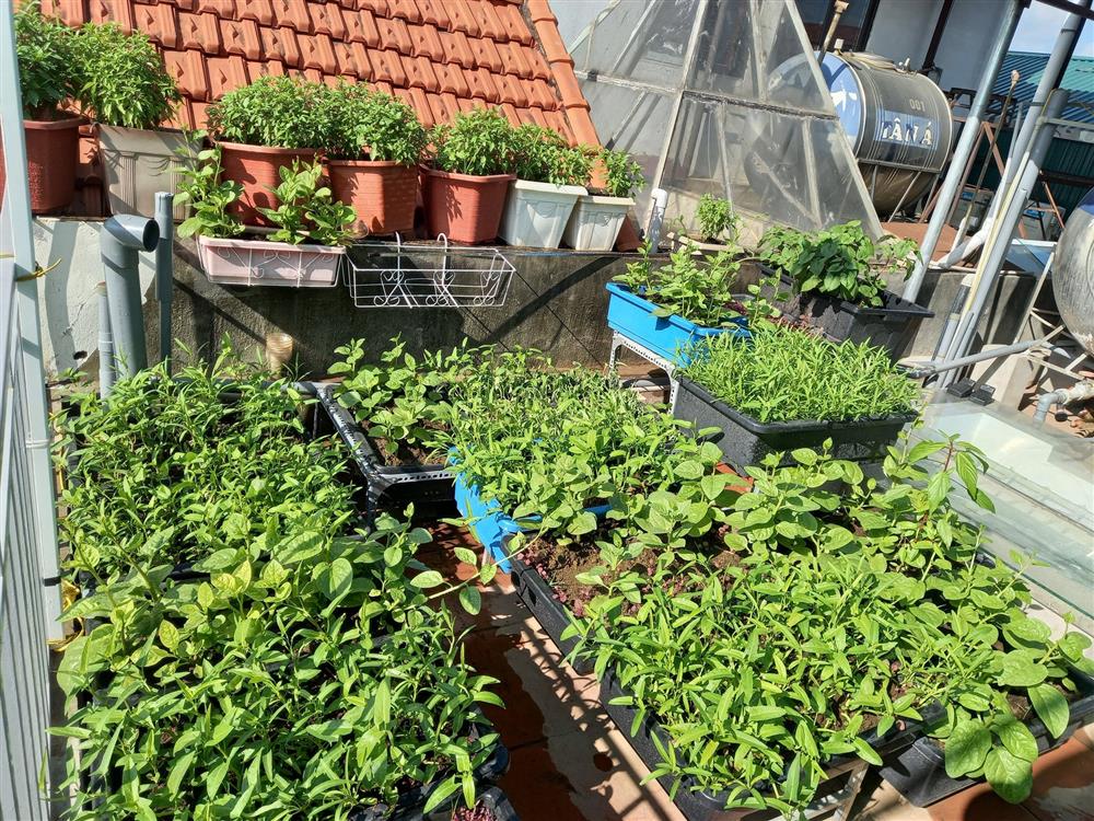 Một góc sắp xếp gọn gàng. Các chậu chủ yếu được đặt ngăn nắp, gọn gàng. Các loại rau nhờ sự thoáng đãng và nhận được ánh sáng, sự chăm sóc kỹ càng nên vô cùng tốt tươi.