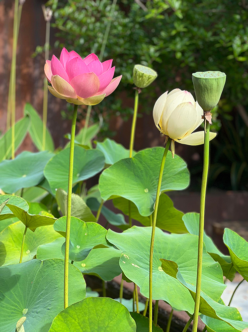 Dương Mỹ Linh yêu quý và chăm chút những khóm 'sen đổi màu'. Cô mua loại đất phù hợp, bón phân chuyên dụng vào tháng ba hàng năm để cây phát triển rồi cho hoa vào mùa hè.