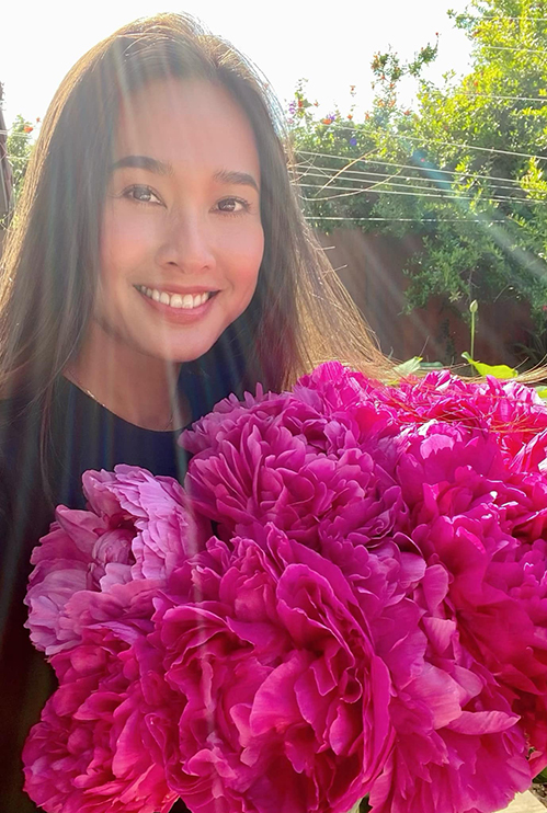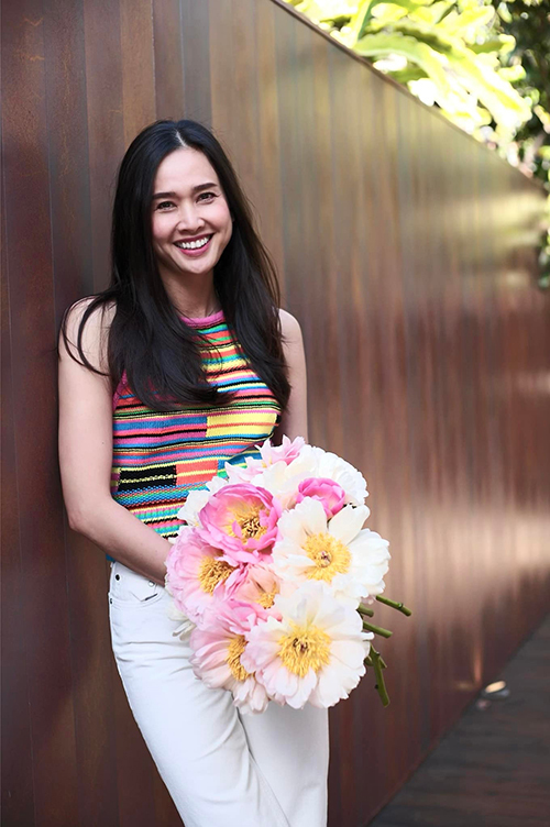 Dương Mỹ Linh cho biết cô có tình cảm đặc biệt với cây cối, đặc biệt là các loài hoa. Dù vườn trồng đủ loại hoa tươi, cô vẫn cắm thêm những bình hoa mua từ các nhà vườn để tô điểm không gian sống. Trong ảnh, cô cầm bó peony cánh trắng, hồng và nhụy vàng.