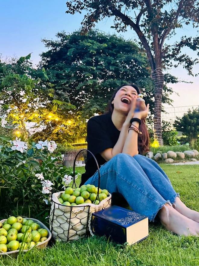 Khu vườn xanh mát và yên bình là nơi Mỹ Tâm tìm thấy cảm hứng và sự bình yên giữa cuộc sống bận rộn. Cô ngồi thư giãn trong khu vườn của mình, bên cạnh là những giỏ táo tươi ngon.