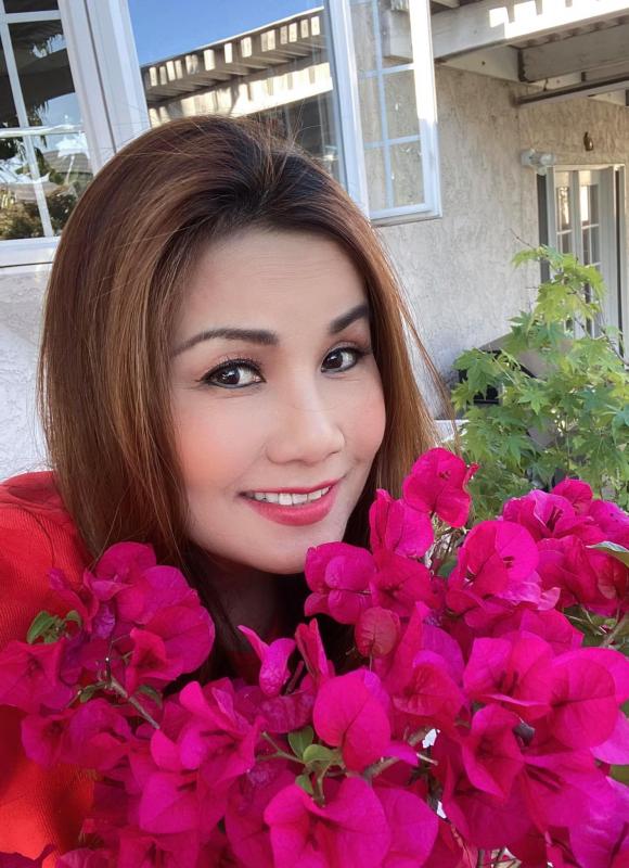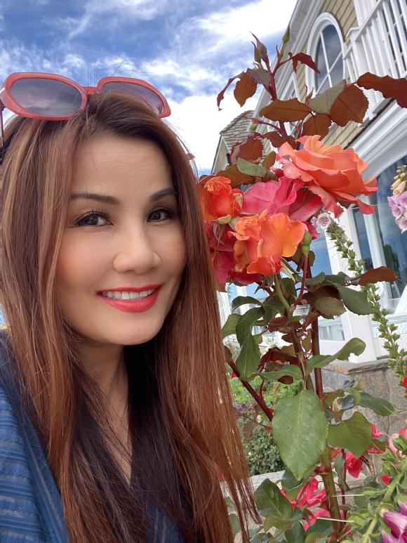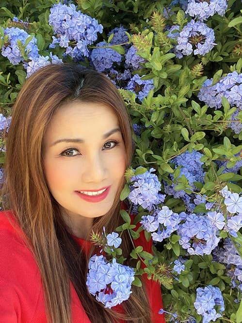 Nữ ca sĩ bên một số loại hoa được trồng trong vườn nhà.
