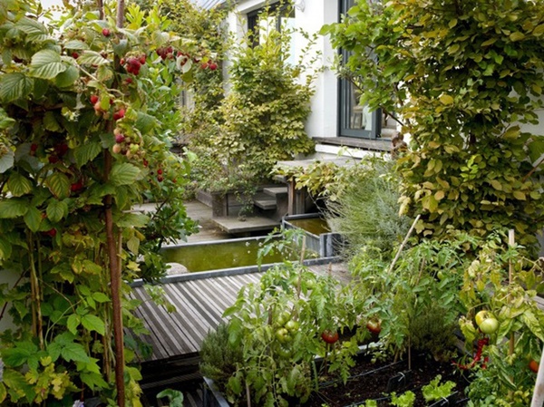 Một góc khu vườn trên mái với rất nhiều cây gia vị, cây ăn trái và hồ nước.
