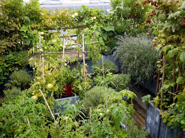 Khu vườn được chia làm hai phần riêng biệt, một là nơi trồng rau hữu cơ để tự phục vụ cho nhu cầu hàng ngày, một là khu vực tắm nắng, thư giãn. Khu vườn tuy nhỏ nhưng hệ thực vật ở đây thực sự phong phú với đủ các loại cây ăn quả thường gặp như cà chua, ớt cho đến táo, các loại cây thảo mộc. Các loại cây này đều được trồng trong bồn cây xây cẩn thận để tiện chăm sóc và chống thấm cho phần mái.