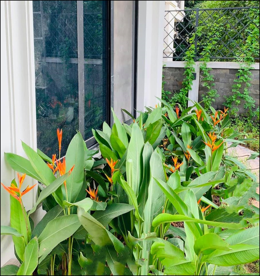 Hoa đăng tiêu khoe màu sắc rực rỡ và bắt mắt gây ấn tượng mạnh và là điểm nhấn trong không gian sống nhiều màu xanh của Lã Thanh Huyền. Đây là loài cây ưa ánh sáng và thường nở nhiều hoa nhất vào mùa hè.