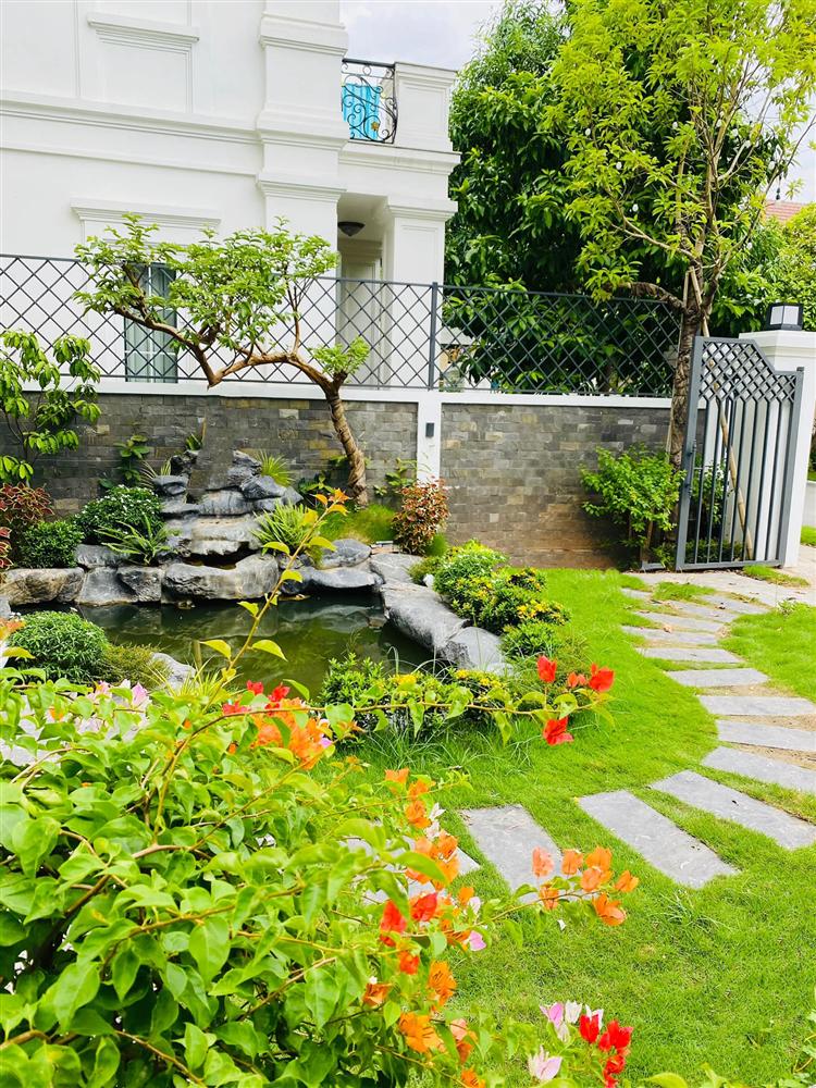 Lối vào căn biệt thự của Lã Thanh Huyền được lát đá, trồng cỏ và không thể thiếu hòn non bộ cho không gian thêm sống động