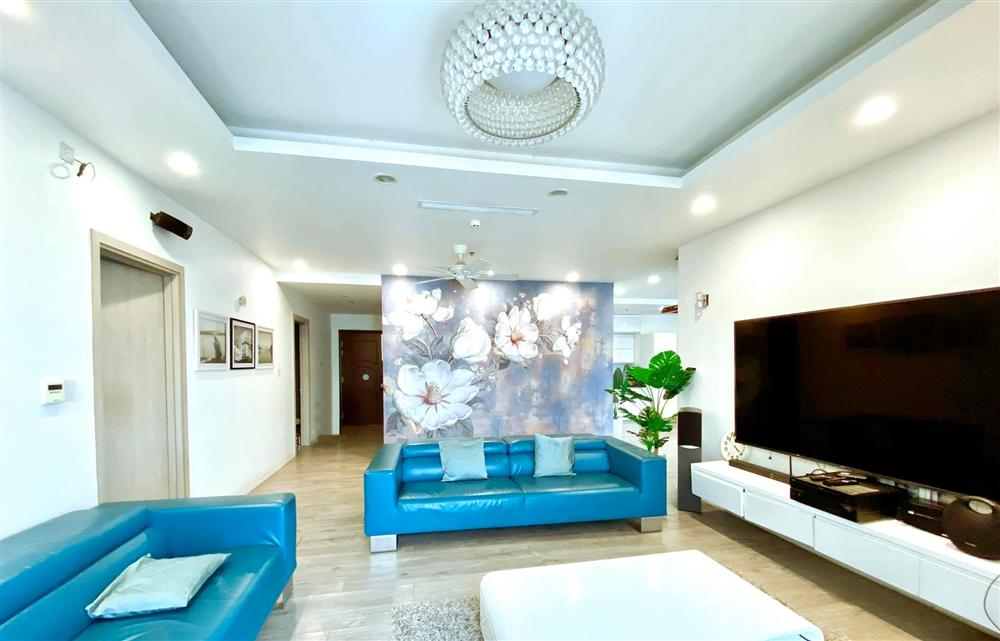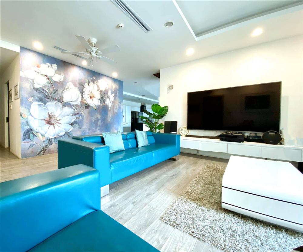 Không gian sống hiện tại của Lã Thanh Huyền được thiết kế phong khách hiện đại, tạo ấn tượng bởi tranh tường và bộ sofa xanh dương.