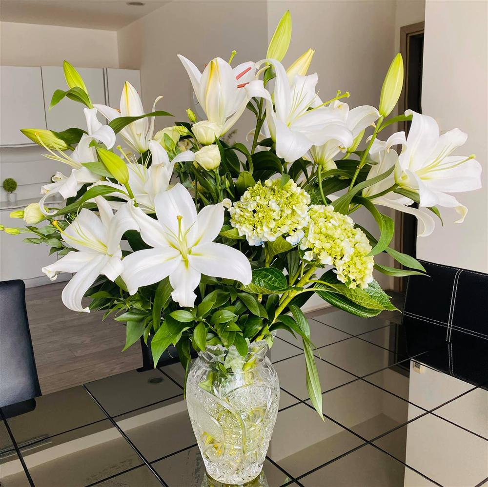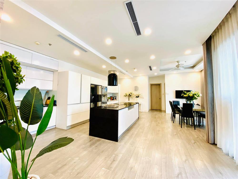 Phòng bếp của gia đình Lã Thanh Huyền cũng rất rộng rãi, sang trọng và không thể thiếu hoa tươi.