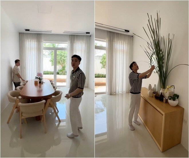 Vào trong nhà, Tun Phạm cho rằng ngôi nhà có diện tích phải đến vài trăm m2, trong khi Long Chun đoán khoảng gần 200m2. Bộ sofa êm ái nhà chuyên gia trang điểm làm đàn em thích thú, cảm giác giống đồ nhập khẩu.