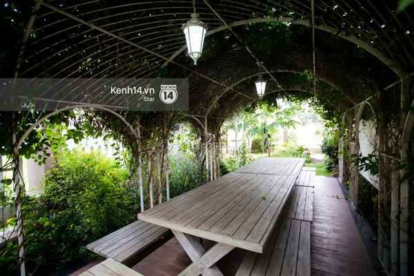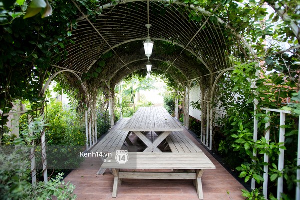 Đặc biệt, không gian làm việc của Quỳnh Hương ngoài vườn khiến nhiều người trầm trồ vì giàn dây leo phủ kín xung quanh chiếc bàn gỗ mộc to dài trông thật yên bình. Bộ bàn ghế gỗ đặc biệt gây ấn tượng bởi nét giản dị gần gũi