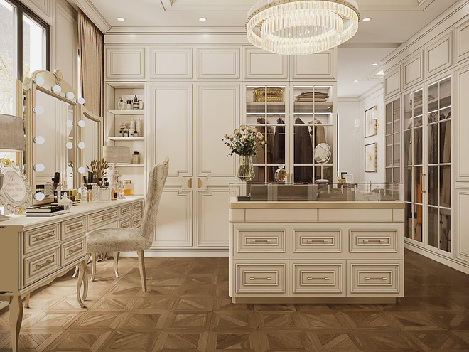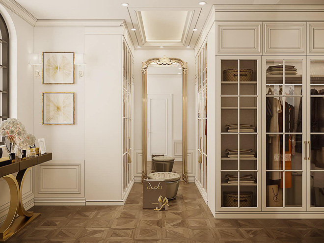 Mới đây, cô nàng tiếp tục chia sẻ thêm một phần không gian bên trong căn biệt thự. Đó chính là phòng để đồ của Lệ Quyên, được thiết kế hệ thống tủ rất gọn gàng, ngăn nắp. Đây dự kiến sẽ là nơi bày những món đồ hàng hiệu đắt đỏ mà Lệ Quyên đang sở hữu.