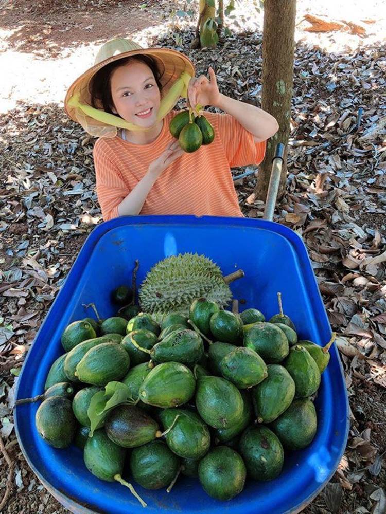 Hình ảnh giản dị của Lý Nhã Kỳ mỗi lần về quê thu hoạch rau trái.