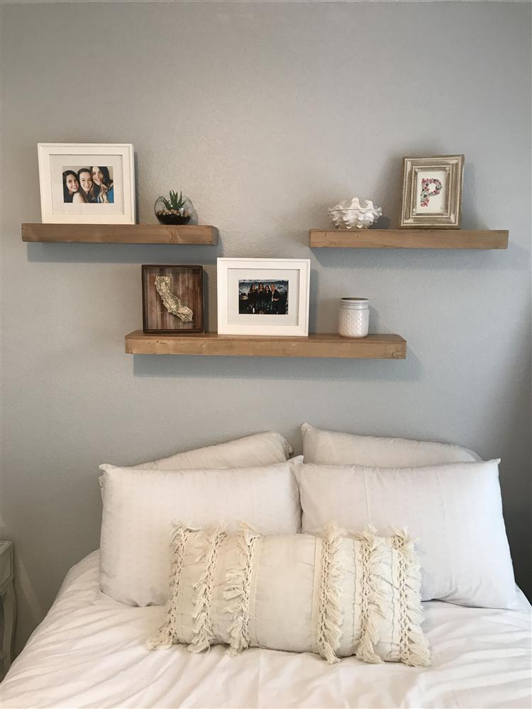 Những chiếc kệ nổi đơn giản có thể làm được từ những thanh gỗ cũ giúp trưng bày ảnh hay những món đồ trang trí nhỏ xinh, hoặc vài cuốn sách sẽ giúp phòng ngủ của bạn trông có hồn hơn.