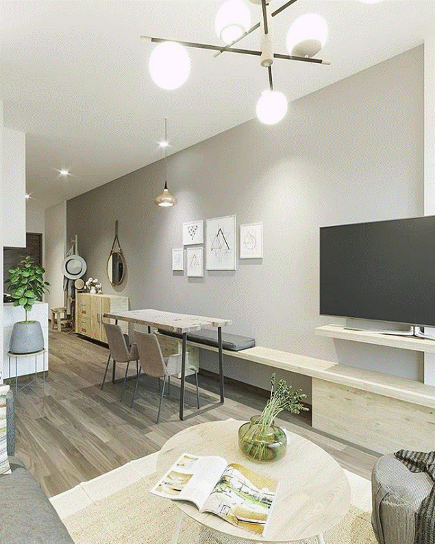 Căn hộ nhìn từ phòng khách trông khá xinh xắn, gọn gàng với chất liệu nội thất chính bằng gỗ.