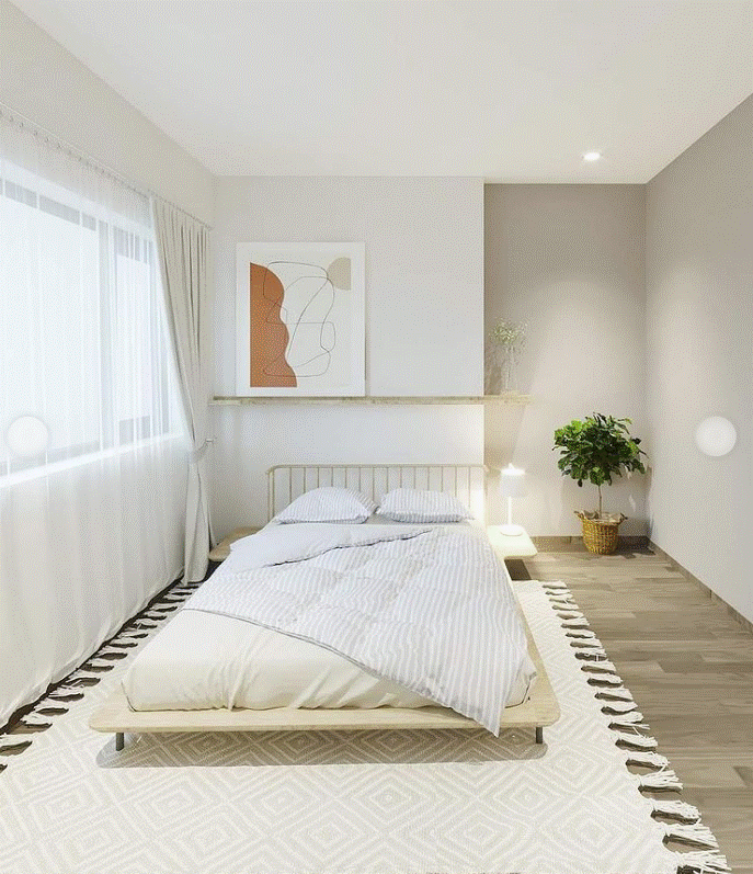 Phòng ngủ sáng sủa dễ chịu với màu trắng đồng bộ từ rèm cửa đến sơn tường, ga gối.
