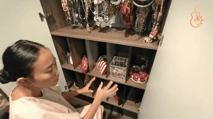 Một góc nữa trong nhà Đoan Trang được hội chị em mê mẩn đó là tủ đồ hiệu. Với phong cách làm nhà tối giản nên tủ đồ hiệu cũng được thiết kế âm tường và chia thành nhiều ngăn nhỏ. Quan niệm về mua sắm đồ hiệu với Đoan Trang cũng độc lạ: Không phải cứ diện cả cây đồ hiệu lên người là đẹp, phải biết chọn lựa các món đồ phù hợp với bản thân, sau đó kết hợp chúng lại để tạo nên cá tính riêng của chính mình. Theo đó, những món đồ hiệu Đoan Trang sở hữu đều là vì thích chứ không phải đắt tiền là mua.