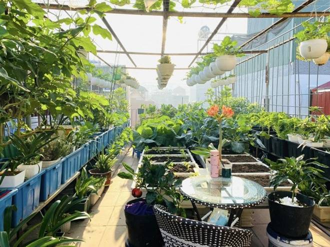 Với mục đích có rau xanh, quả sạch phục vụ những bữa cơm gia đình và bản thân cũng có sở thích làm vườn, đồng thời lấy chỗ để giải trí, cho các con trải nghiệm nên chị Phượng đã xây vườn rau trên sân thượng từ năm 2017. Vườn nhà chị rộng tầm 50-60m2 và chi phí đầu tư khoảng 30 triệu cho giàn chậu, giá kệ và tiền mua đất.