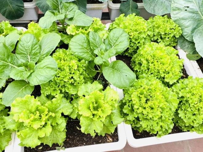 Khu vườn trên sân thượng nhà chị Phượng có đủ các loại rau phục vụ cho gia đình.