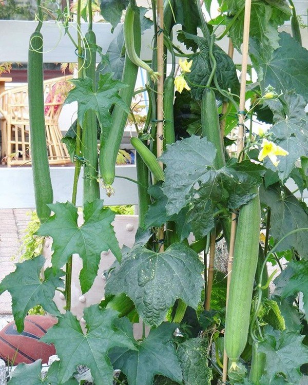 Ngoài trồng hoa, chị Thanh còn trồng vô vàn các loại rau khác nhau, ngoài rau Việt Nam chị mang hạt giống sang trồng như mướp, mùng tơi, cải, đỗ quả, bầu, bí, mướp, su su, cà pháo và đủ bộ rau gia vị như kinh giới, tía tô, húng quế, húng láng, hành hoa, ngổ… thì chị còn trồng nhiều giống rau có sẵn ở Đức như xà lách, ớt, sả, bí ngồi để phục vụ sinh hoạt hằng ngày. “Bí đao, su su, mướp nhà mình rất sai quả nên ngoài cho bạn bè thì mình dự trữ đủ để ăn mấy tháng mùa đông luôn” – chị nói.