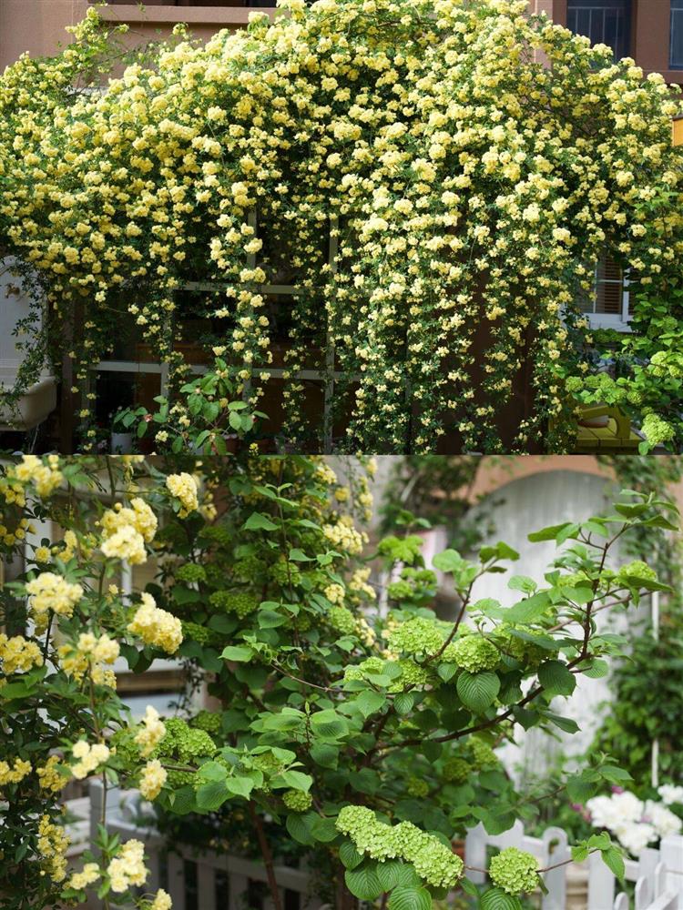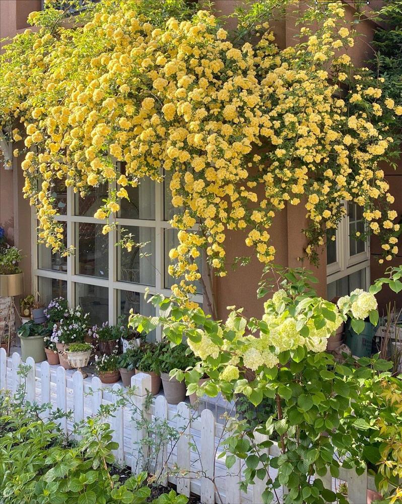 Đặc sắc, thu hút nhất trong khu vườn này phải kể đến giàn hoa hồng leo mân côi. Sau 4 năm chăm sóc, giàn hoa hồng leo mân côi phát triển um tùm, tươi tốt. Nhất là khi mùa xuân đến, cây bắt đầu nở hoa khiến màu vàng tươi phủ kín cả một góc vườn.