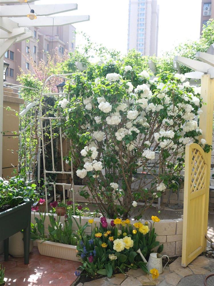 Một cây tuyết cầu thân gỗ được trồng ngay bên phải cổng vào. Đúng như tên gọi, sắc hoa trắng muốt như tuyết, nở những bông to khiến bạn khó có thể làm ngơ khi nhìn thấy. Đây cũng là loài hoa mà chủ nhân khu vườn vô cùng yêu thích bởi nó tượng trưng cho sự vĩnh cửu.