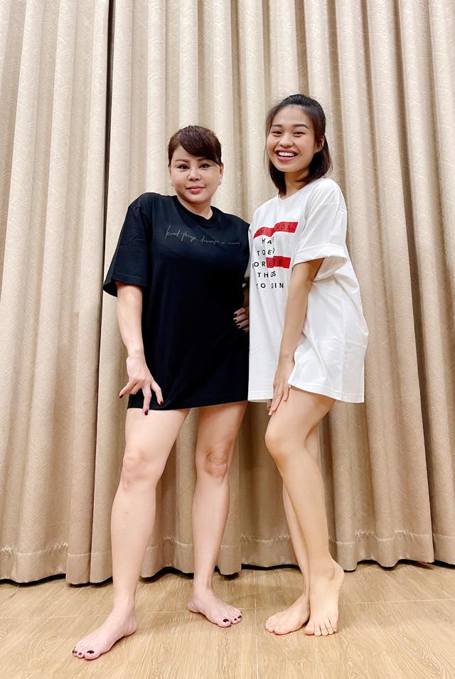 Hình ảnh nghệ sĩ Lê Giang và con gái Lê Lộc khi ở nhà. Cả hai mẹ con nữ nghệ sĩ trẻ trung khi diện mốt giấu quần. (Ảnh: FBNV)
