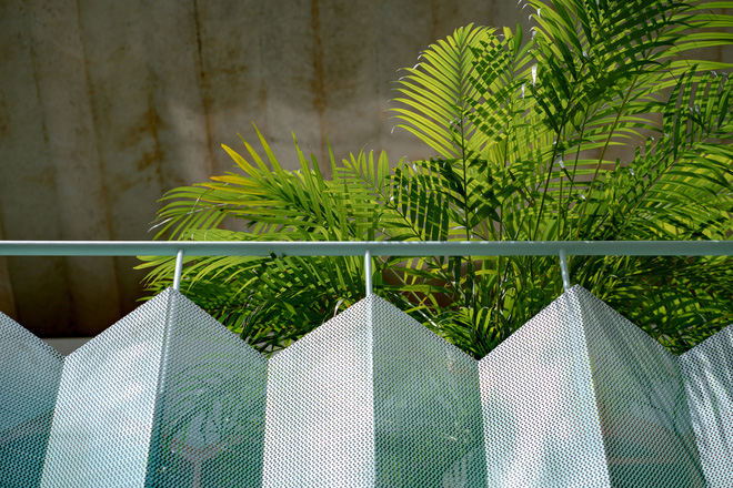 Phần sân trước với tấm lưới sắt thoáng đãng và ngập tràn ánh sáng tự nhiên