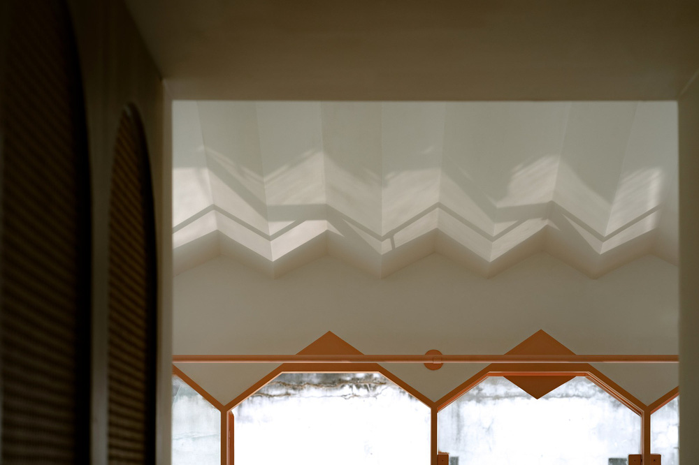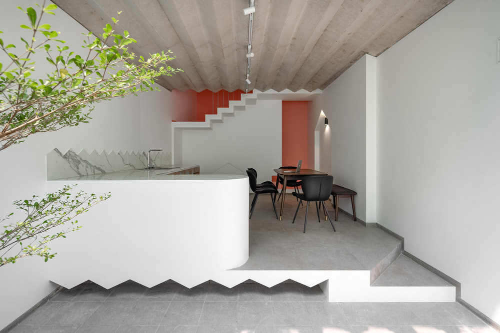 Điểm nhấn của căn nhà chính là phần đường nét zigzag được sử dụng suốt các khoảng không gian từ trong ra ngoài. Từ cửa trước, đến trần nhà và cả phần nền, tất cả đều theo những nét zigzag phá cách.