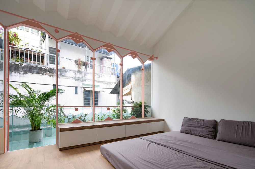 Phòng ngủ tối giản với phần trần zigzag đặc trưng của căn nhà