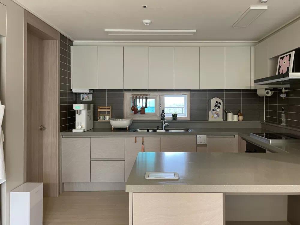 Mặt trong của quầy tủ được tăng thêm 3cm, có thể nhân đôi không gian lưu trữ ngay lập tức mà không cản trở việc sử dụng mặt bàn. Một quầy bar nhỏ kéo dài bên phải bếp nấu, mặt bếp rộng rãi là nơi nữ gia chủ nghiên cứu các món tráng miệng.