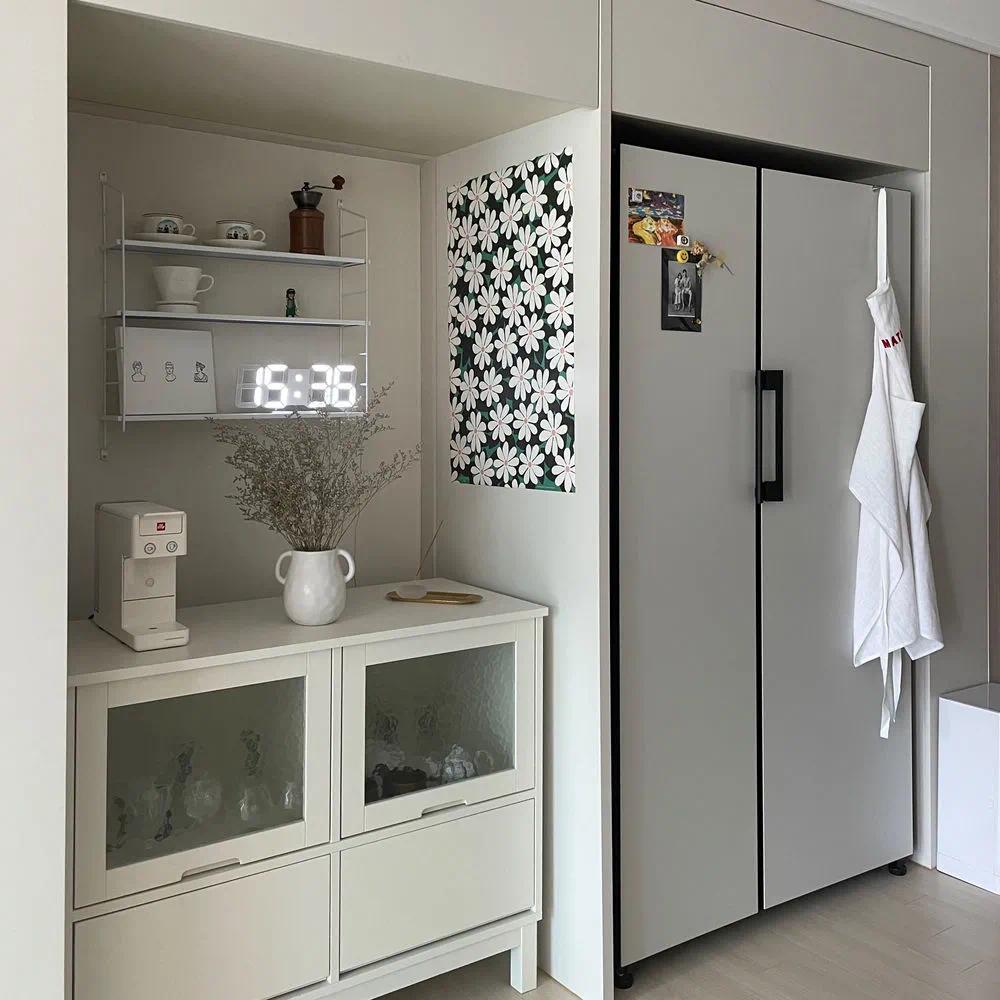 Tủ lạnh đặt giữa bếp và phòng ăn, dẫn ra hai không gian rất thuận tiện, bên trái có một bàn kính nhỏ, bên trên đựng ly cà phê. Một chiếc bàn dài được sắp đặt để tạo không khí ăn uống tốt hơn, kể cả khi nhà có khách thì chiếc bàn này vẫn đủ cho cả một nhóm người dùng bữa.