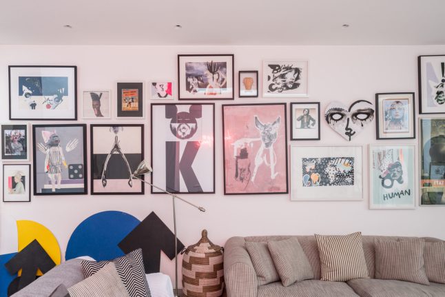 Các bức tranh với hình ảnh độc đáo, chiếm gần hết bức tường phòng khách. Mỗi bức tranh thể hiện một câu chuyện, chủ đề riêng nhưng đều toát lên vẻ cá tính, mạnh mẽ