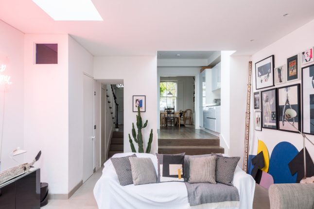 Phòng khách phân chia thành hai lối đi khác nhau. Một lối thẳng lên phòng bếp và phòng ăn. Lối còn lại dẫn tới cầu thang đi lên tầng. Việc phân chia như vậy có ưu điểm là ngăn mùi thức ăn và hơi nóng từ nhà bếp bay lên khu vực phòng ngủ phía trên nhà. Tuy nhiên, nó cũng có hạn chế là việc phân chia sẽ khiến không gian bị hạn hẹp đi một chút